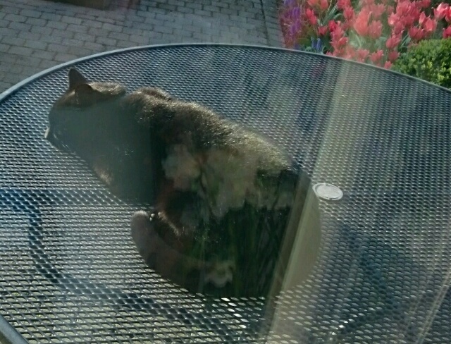 Любимое место Мишки. Спит и одним глазом следит за обстановкои.