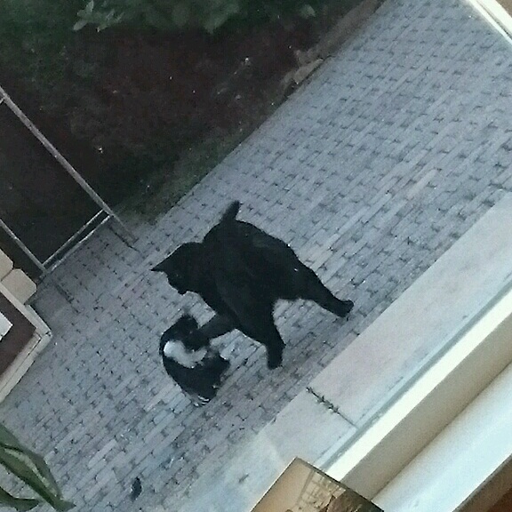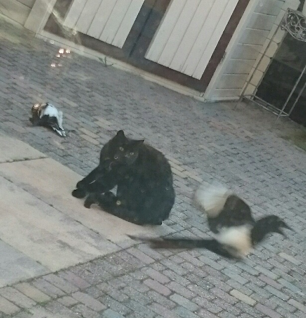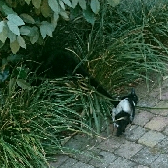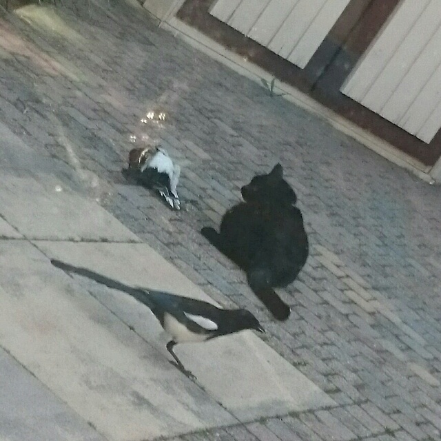 Сейчас мы наблюдали мир животных. Миша поймал самую крикливую сороку, свернул ей шею, и начал с ней играться прям под окнами нашей кухни . Прилетели др. сороки, и давай на него галдеть. Окружали его, провоцировали..