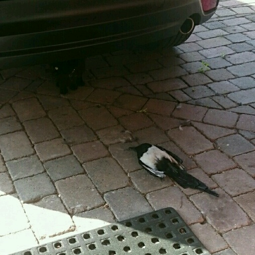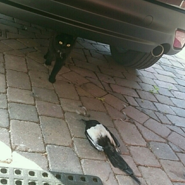 , пришлось выйти во двор, забрать эту сороку. (выбросила её в мусорный контейнер) Миша спокойно мне её отдал, и сейчас охотится на других.