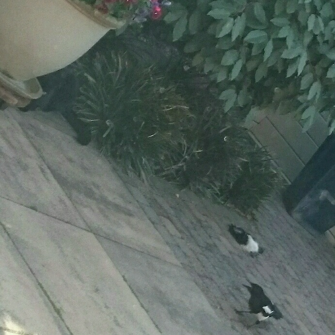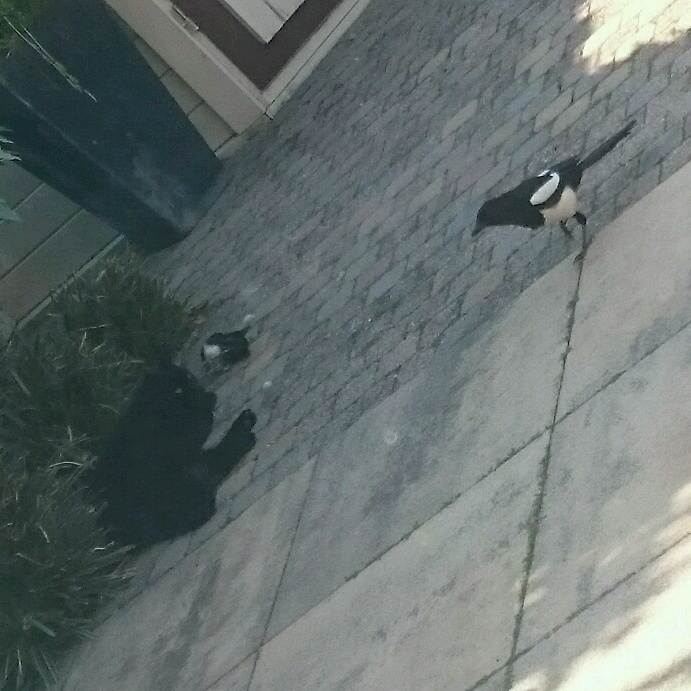 Мы только собрались сесть за стол, как он прибежал с этим птенцом в зубах, завидев кровь, я передумала ужинать, и в этот раз, он уже не отдавал мне птенца, как он делал с др. сороками. Хватал в зубы, и метался по саду, в поисках убежища. В какой-то момент, мне удалось отнять у него добычу, иначе стоял такой гвалт от сороки, это пипец. Она же злится на кота, стрекочет, лезет к нему, а он так и ждет момент чтобы и ей двинуть ногтями, и такой кипиш они устраивают...когда добыча пропадает( с моей помощью), они успокаиваются на время.
