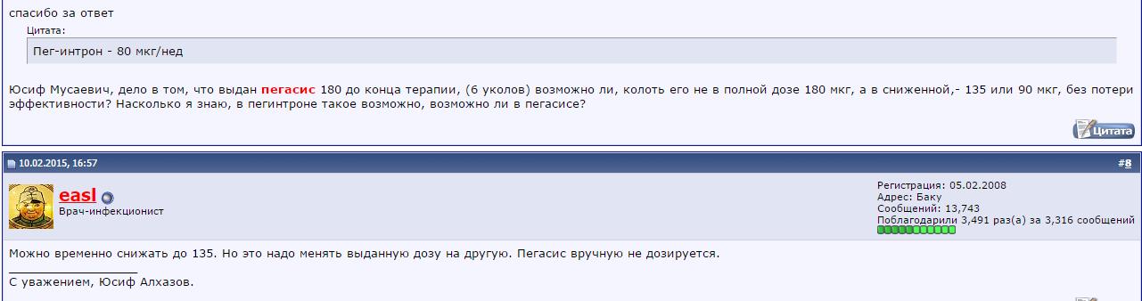 теоретически наверное и можно, практически нельзя потому, что пегасис, это альфа 2а, - который не корректируется по весу, только соответствующая дозировка.Например пегинтрон и альгерон, это альфа 2b который вполне успешно корректируется в обе стороны, исходя из 1.5 мкг*кг/веса=доза, с пегасисом такое не прокатывает, вопрос неоднократно поднимался на русмеде, и ответ всегда был однозначным.ТяниТолкай писал(а):но почему, теоретически, нельзя дозу уменьшить -то?