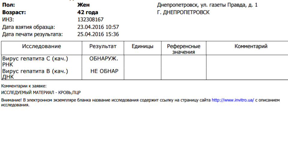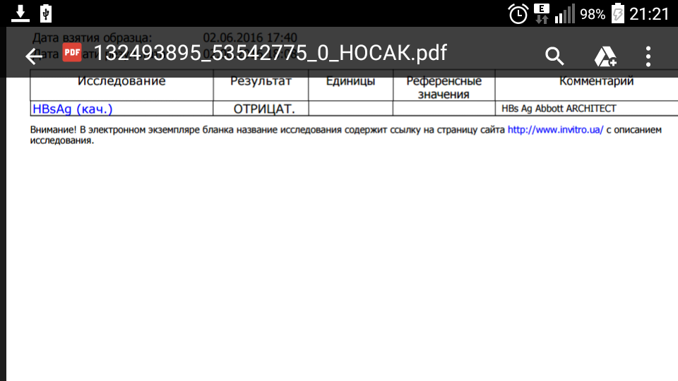 в инвитро перед началой теры сдавала в субботу кровь на количество, зашла в лабу и попросила сделать если осталась кровь дополнительный анализ на HBsAg, те антитела я сдавала не в инвитро. пришел ответ - HBsAg (кач.) ОТРИЦАТ. HBs Ag Abbott ARCHITECTYugo69 писал(а):Капрызуля