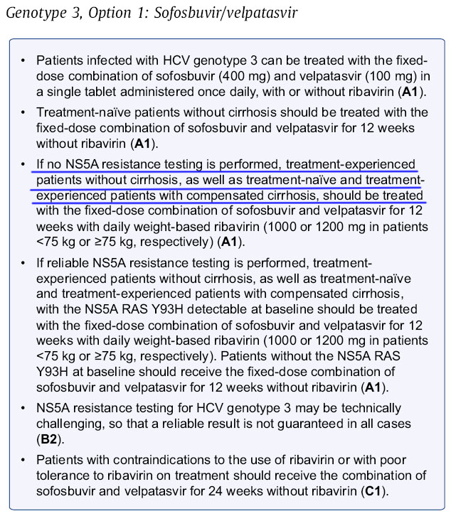 Если тест на резистентность к NS5A не проводился, пациентов без цирроза имеющих опыт лечения, а также найтивных и имеющих опыт лечения с компенсированным циррозом, следует лечить комбинацией фиксированной дозы софосбувира и велпатасвира 12 недель с ежедневной дозой рибавирина в зависимости от веса...