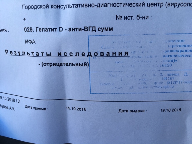 HBeAg - ; anti-HBe + ; anti-HDV total - ; anti-HCV total -