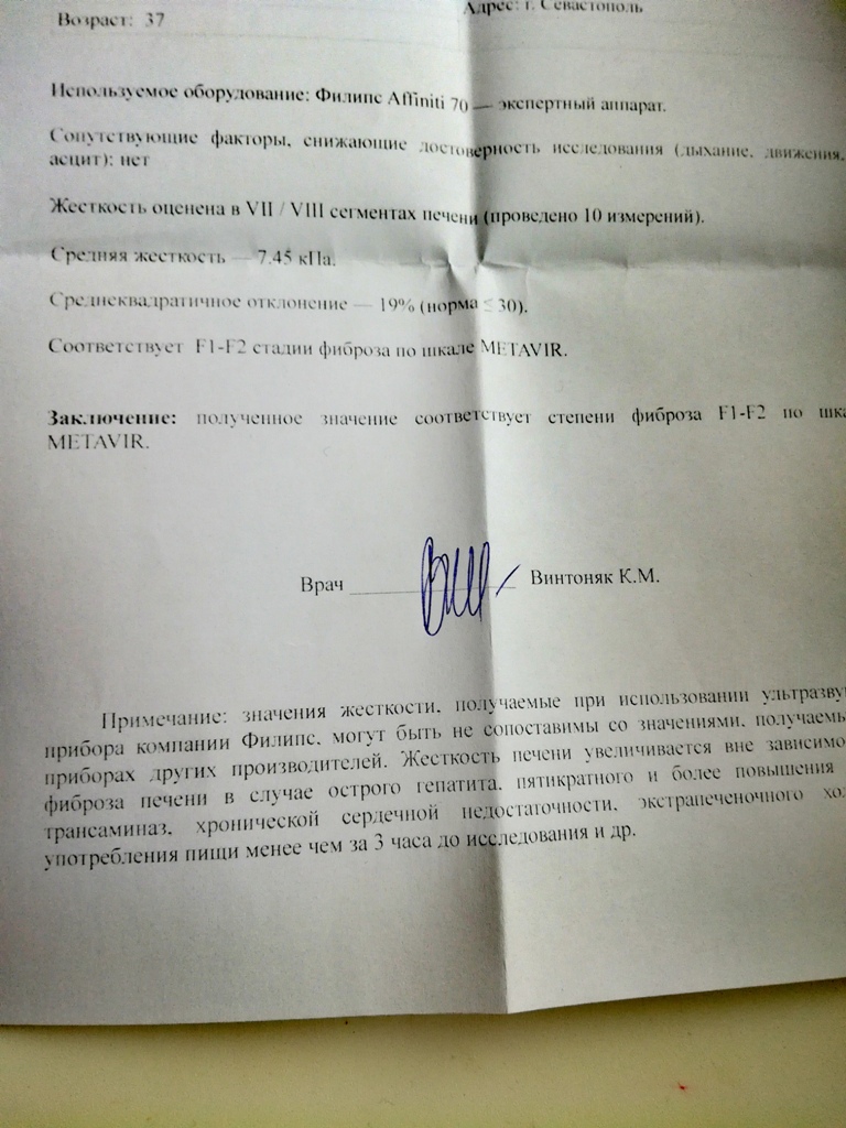 Я честно рассказала всю ситуацию с плюсами, минусами и нервами за последнее время. В общем, по итогу: F1-F2. Сказала, что много людей без гепатита имеют печень в таком состоянии, это связано с приёмом лекарств и т.д. У меня же ещё и жёлчный отстутствует, может и это тоже давать своё
