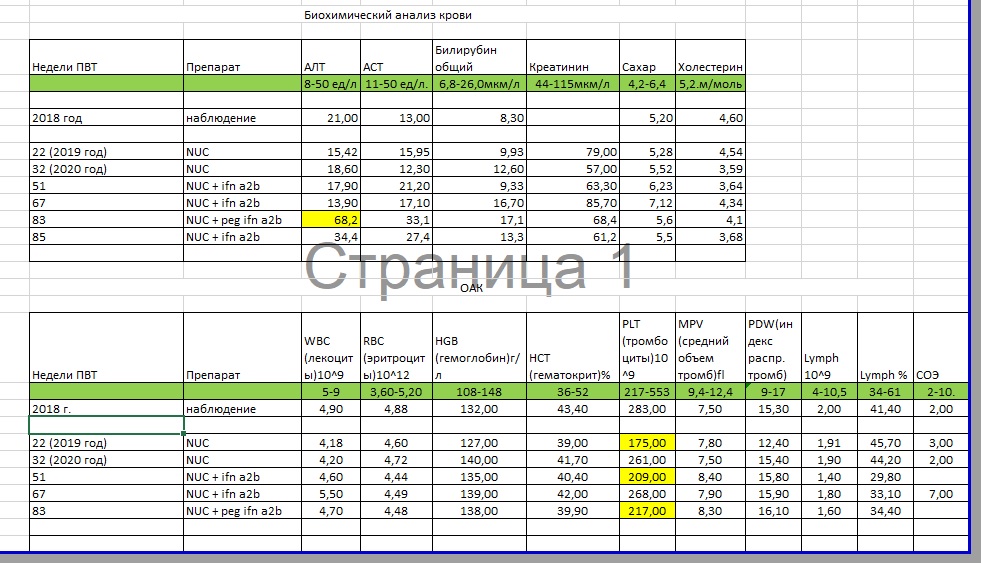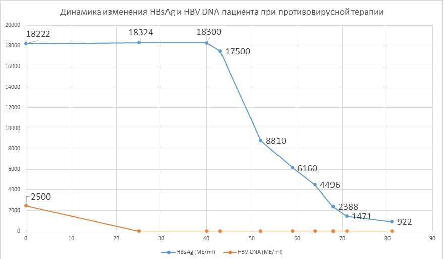 19.11.2016 Старт ПВТ Тенофовир; 5.01.2017 АЛТ 260; 15.02.2017 ПЦР 16000МЕ/мл, 15.05.2017 - 560МЕ/мл, АЛТ 31; 18.10.17 - не обнаружен, 5.01.18 - АЛТ 16; 1.06.2018 qHBsAg 1238ME, 12.04.2021 qHBsAg 750ME