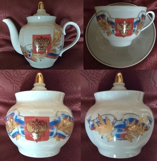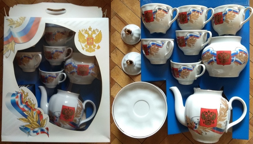 Настольные часы с госсимволикой есть, сервиз есть. Были всякие пледы, наборы постельного, одеяло, еще всякая хр&нь...