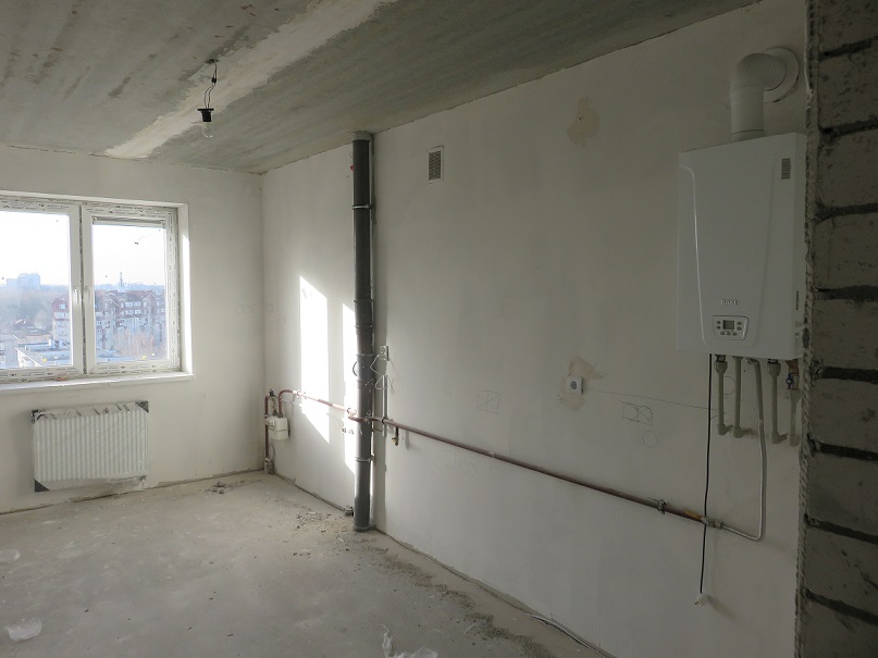 больше всего бесит канализационная труба, это нужно ставить короб, а этот короб нужно будет как -то обыгрывать кухонными шкафами.