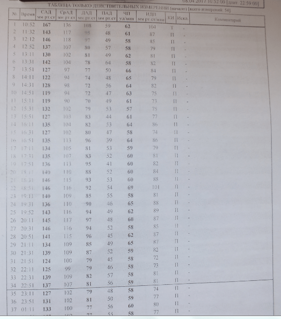 С субботы на воскресенье,носил прибор для суточного мониторинга артериального давления. Часть результата,для понимания,ниже. Средне суточное значение получилось 133/84. Это при том,что принимаю эналаприл 10 утром и 10 мл вечером+ раз в сутки анаприлин 50. Врачу сказал что ничего не принимаю,так как нужно проходить водительскую мед комиссию,что бы не было лишних телодвижений. Так же,в заключении было написано ,,феномен белого халата,,. Прежде чем вешать прибор,измерили давление,было 167/108.