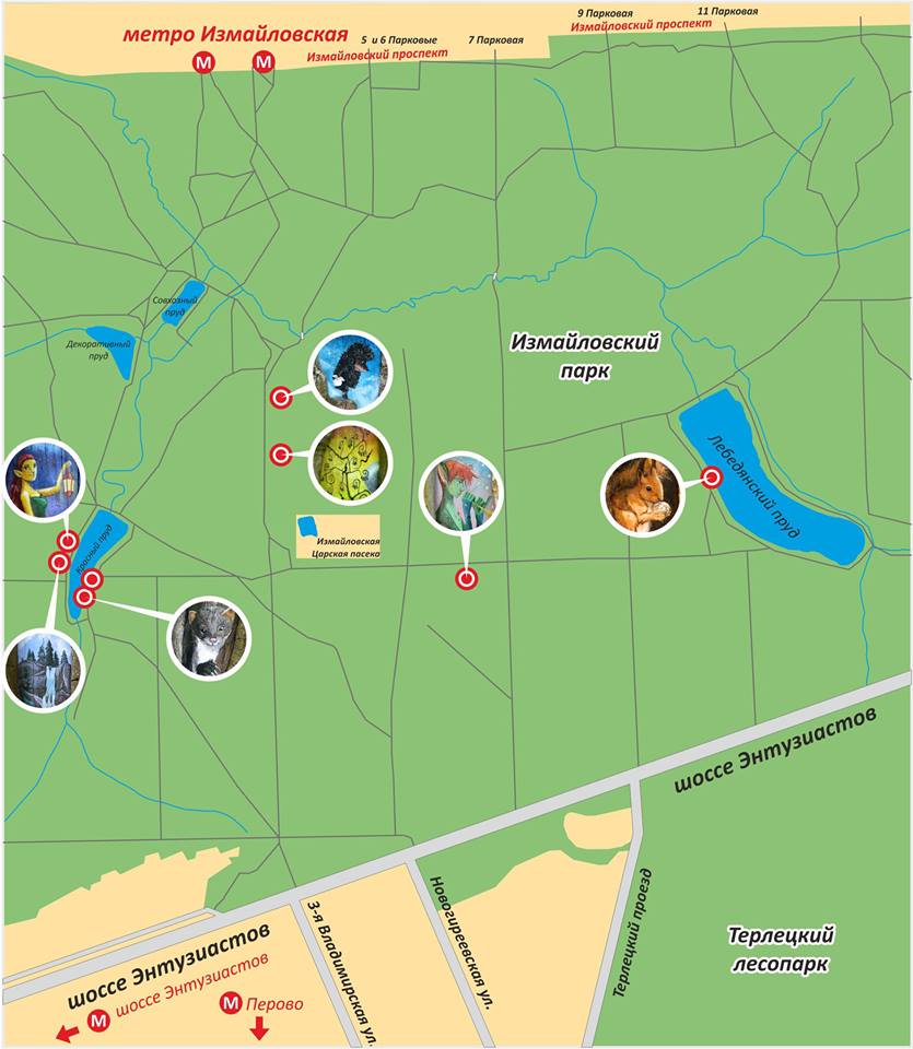Вот схема рисунков в Измайловском, она довольно приблизительна, найти не просто. Может, пройдешься когда