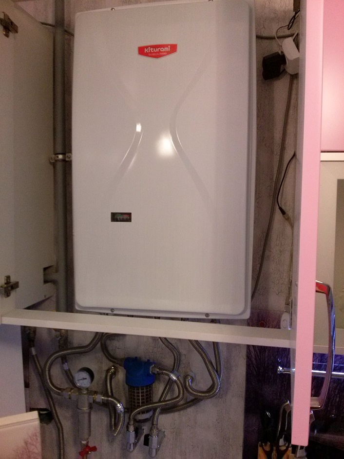 как я поняла, это турбированный двухконтурный котёл, с закрытой камерой сгорания, можно прятать в шкафчик. сверху отверстие есть, между стенками более 5 см, дверцу у шкафчика лучше было сделать решётчатую.