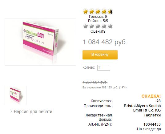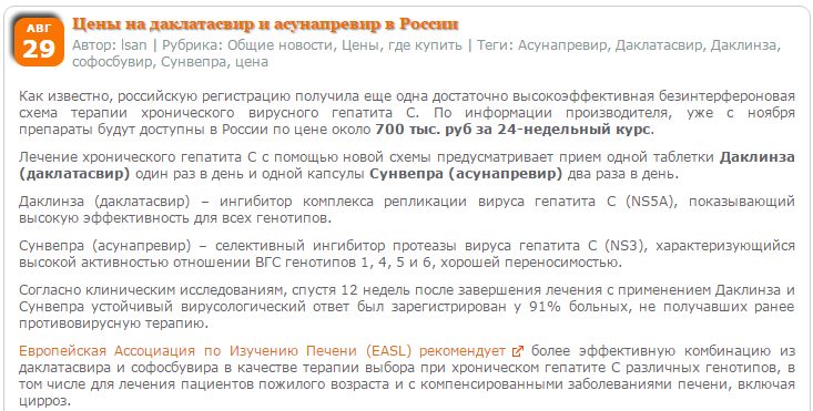 Да тут такие цены вряд ли кому то нужны! Люди за 130 тысяч курс на 24 недели берут и минус получают, а вы десятки тысяч долларов пишите)Михаэль Ефимов писал(а):По ценам на Harvoni, Sovaldi, Olysio и других лекарств, можно почитать здесь: