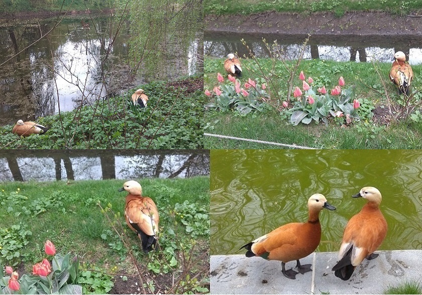 В саду много уток-огарей. Они на прудах, на каналах, в тюльпанах, на дорожках.