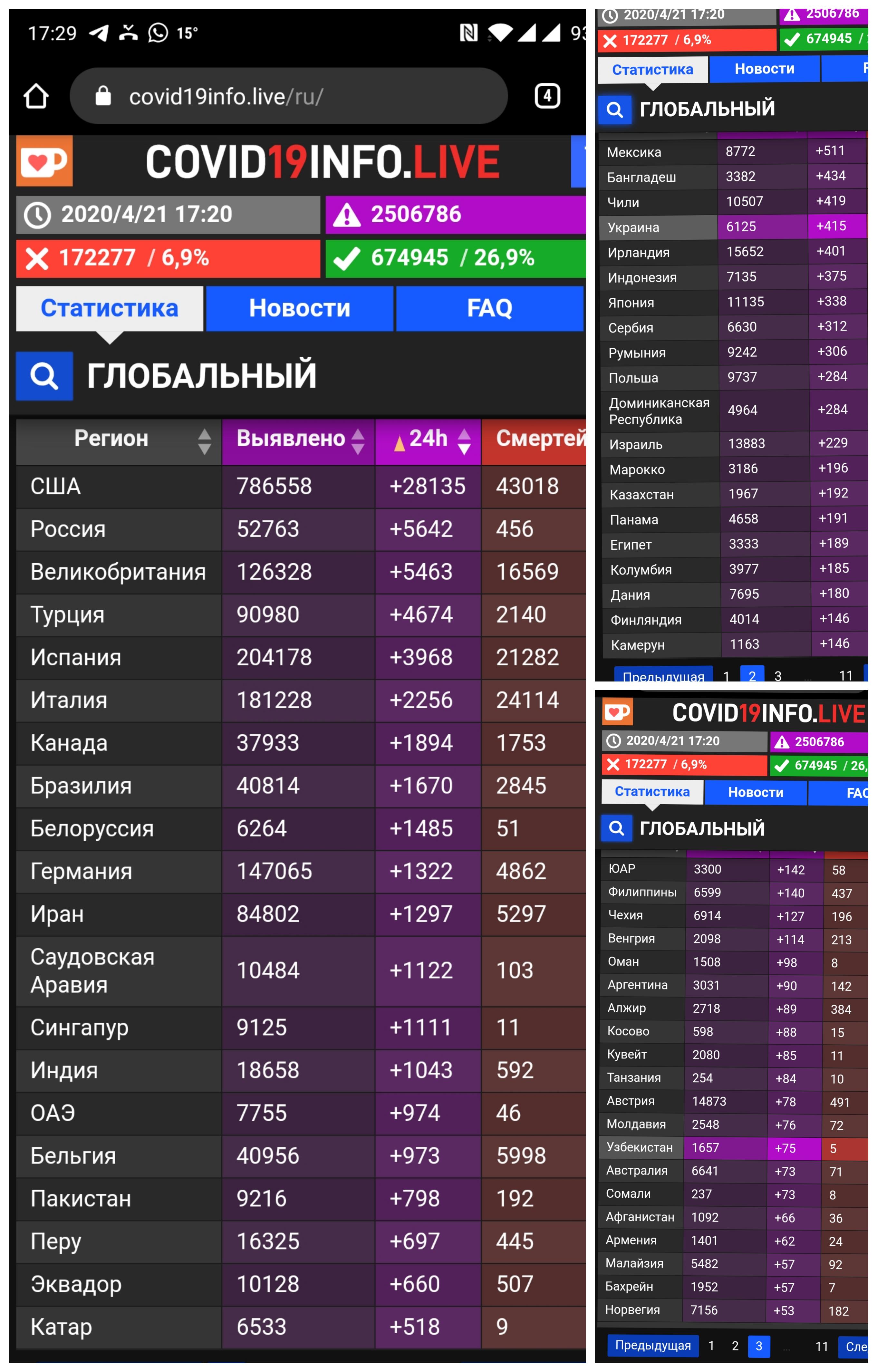 3. По РБ данных новых опять нет, Украина вернулась на 24 место с 415 новыми больными, также произошел обвал в Казахстане (33 место) 192 больных