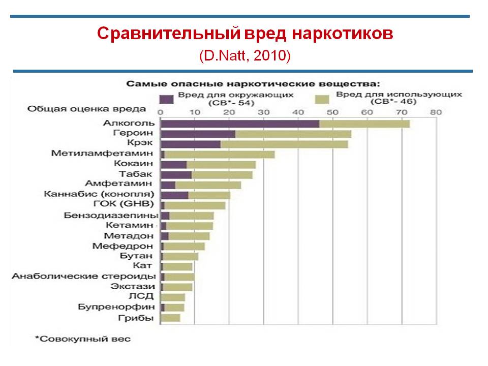 Это заблуждение. Если хотя бы немого изучить тему, то картинка меняется. Я говорю о КИ. Могу предоставить вам весь материал, существующий в мире по каннабису, сгрупированный в одну серьёзную работу, а пока ознакомьтесь с сравнительной таблицей вреда различных веществ, используемых человеком для кайфа.