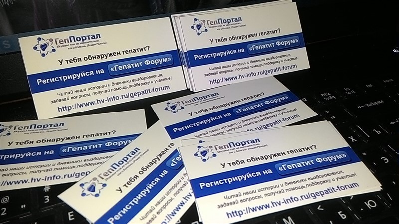 МЫ собрались в троём все больные гепатитом С я сам инвалид 2гр.за 2015 год 5раз лежал в больнице ,на вашем сайте мы все узнали многое и постараемся напечатать и распространить ваши визитки.У нас добрая половина не знает 10% инфы за год семь месяцев мы с другом узнали на сайте,Огромное спасибо всем вам!!!
