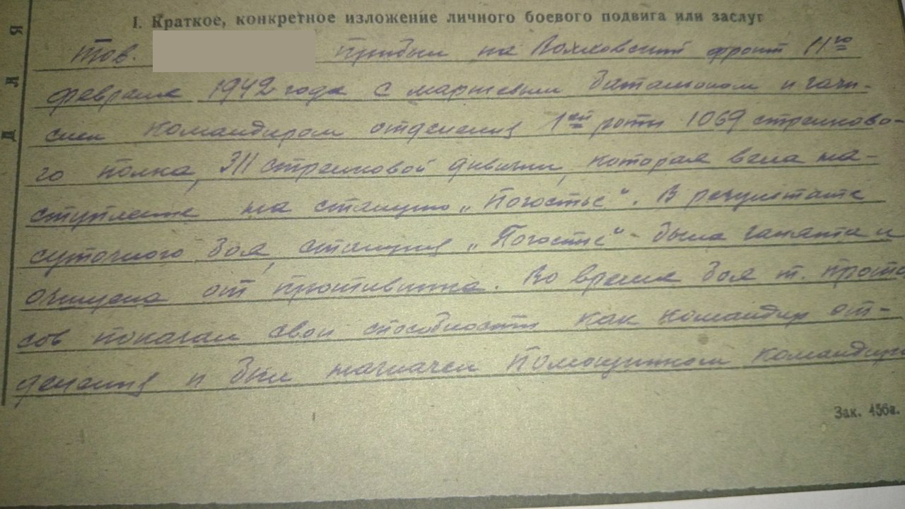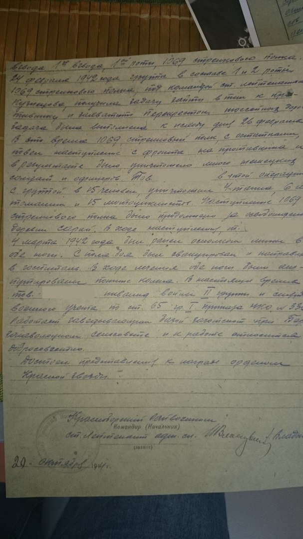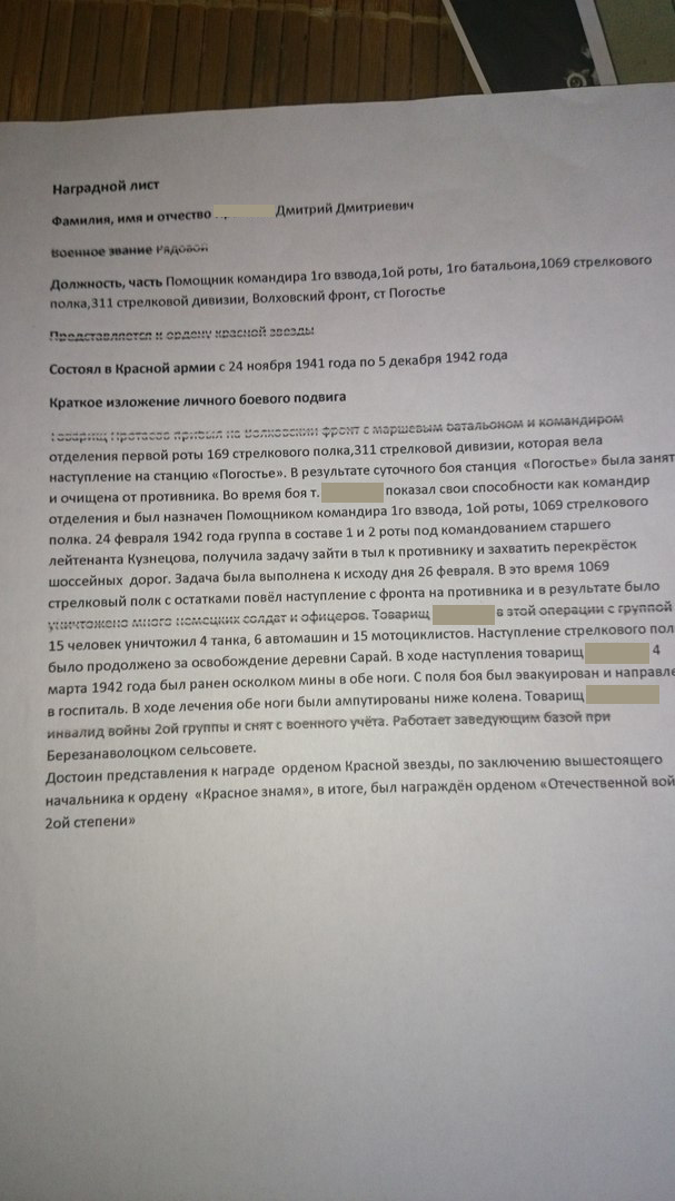 Дед, Дмитрий Дмитриевич, призван в 1941г. с Архангельской области. Один бой 24.11 1941 ранен в обе ноги осколком 4 марта 1942г., госпитализирован, обе ноги ниже колена ампутированы. Война в четыре месяца.... Протезы до сих пор лежат в гараже, не поднимается у отца рука их выкинуть... Дед умер до моего появления на свет