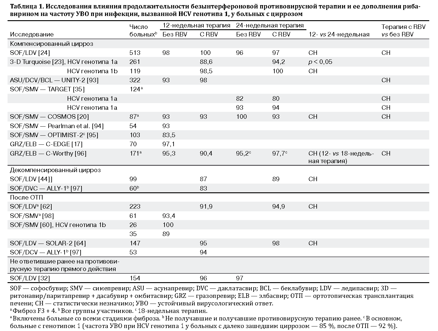 Необходимость наличия RBV в терапии у больных с циррозом в проспективных исследованиях, за исключением двух, не изучалась. Данные о влиянии его включения на эффективность терапии разноречивы (см. табл. 1). При использовании схемы 3D отмечена тенденция к меньшей частоте УВО у больных с HCV генотипа 1a по сравнению с HCV генотипа 1b [12, 23]. По данным европейского исследования Pearl IV [12], УВО после терапии по схеме 3D + RBV или плацебо наступил у всех больных без цирроза с HCV генотипа 1a. Немногочисленные случаи резистентности к терапии отмечены в США. Они свидетельствуют о географических различиях распространенности исходных мутаций вируса, придающих ему устойчивость, подобных обнаруженным при использовании SMV [75]. К сожалению, эффективность схемы 3D без RBV у больных с циррозом не изучена. По данным исследования UNITY-1, большую часть участников которого составляли жители США [76], частота УВО у не реагировавших на предшествующую двухкомпонентную терапию больных с HCV генотипа 1a при 24- и 12-недельной терапии значительно отличалась (93 vs 80 %). Как бы то ни было, добавление RBV стало почти правилом в отношении некоторых групп, например при 3D-терапии у больных с HCV генотипа 1a или применении SOF/LDV у ранее получавших противовирусную терапию больных с циррозом. В условиях реальной практики выполнено несколько сравнительных исследований терапии с RBV и без него. По данным французского наблюдательного когортного исследования ANRS CO22 HEPATHER [30] и большого когортного исследования в Великобритании [77], добавление RBV или увеличение продолжительности терапии до 24 нед. увеличивали частоту УВО, но эти исследования несвободны от искажений, связанных с отбором пациентов. По другим данным, УВО достигался с той же частотой и без использования RBV [69].