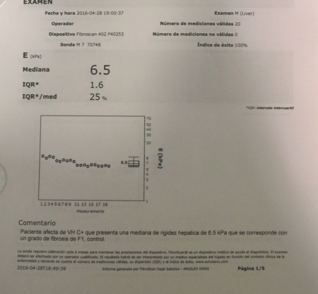 Я отказалась, поскольку чувствую себя прекрасно, но психологический урон был нанесён большой. Я считала, что такое моё самочувствие временно и мне недолго осталось жить здоровой жизнью . В Барселоне через 2.5 года в серьезном госпитале я прошла Фиброскан опять.