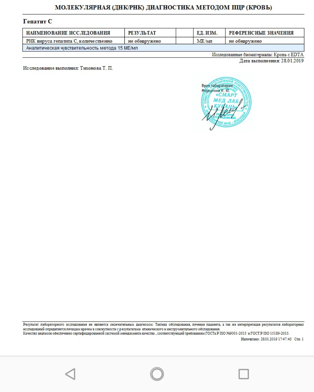 ГепС 3в Ф-0 старт 30.10.2018 Sof+Vel 12 недель. 2 недели- АЛТ-26.5. АСТ-25.9.ПЦР качественный -положительный. 4 недели-АЛТ-18.2. АСТ-27.5. ПЦР качественный- положительный, 6 неделя- АЛТ -19, АСТ-23, ПЦР качественный-обнаружено. Начала пить рибавирин. 10 неделя- АЛТ -17, АСТ-21. ПЦР РНК качество-обнаружено. 12 недель - ПЦР обнаружено. 14 недель- ПЦР обнаружено. Количество- не обнаружено???? 18 неделя-ПЦР первый минус!!!!! 24 неделя-ПЦР качество не обнаружено!!! Конец терапии!УВО 12 недель!