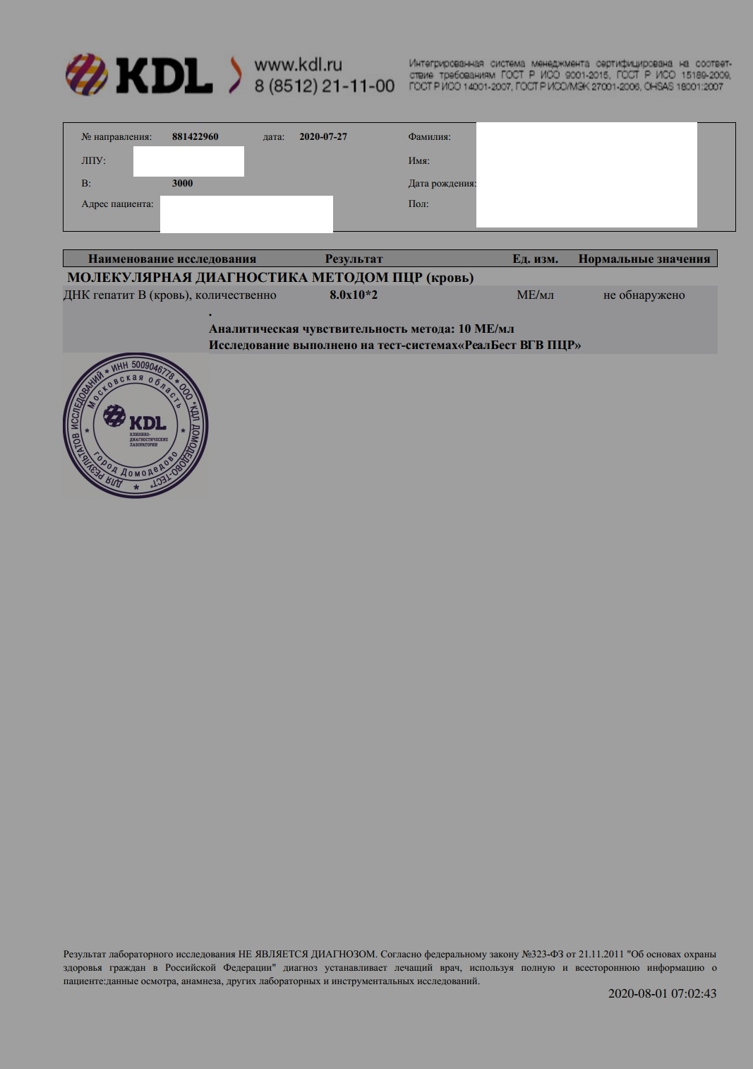Спустя 3 месяца и по сей день ДНК ПЦР стабильно не обнаружено, трансы стабильно в норме.