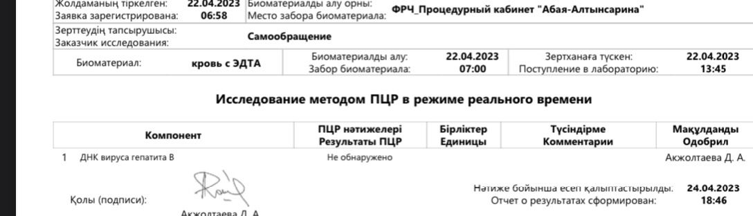 Добрый день!smilla писал(а): ↑18 мар 2023 22:42 KDN, АЛТ у вас совсем немного вышел за норму, не о чем пока беспокоиться. Через 2-3 недели пересдайте еще раз АЛТ и анализы по гепатиту Д - ПЦР РНК качество HDV-RNA, суммарные антитела anti-HDV total и антитела острой фазы anti-HDV IgM. В Алма-Ате есть лаборатории Инвитро, попробуйте сдать эти анализы там.