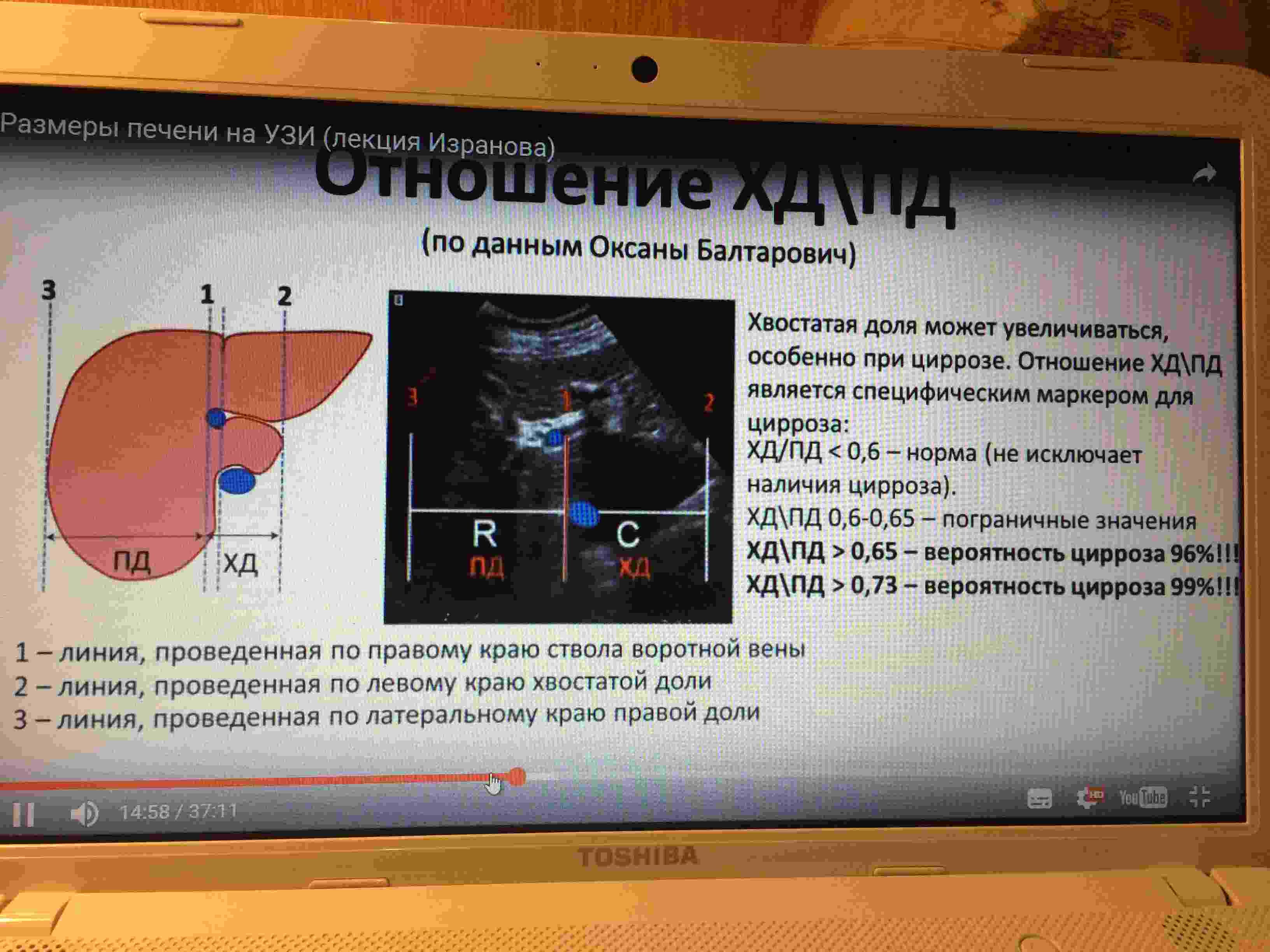 Я пересмотрела после смены Ваше заключение, там есть одна опечатка- в разделе, где описана хвостатая доля, нужно читать- отношение толщины хвостатой доли к толщине правой доли печени. Норма менее 0.6 ( в приложении пояснение).