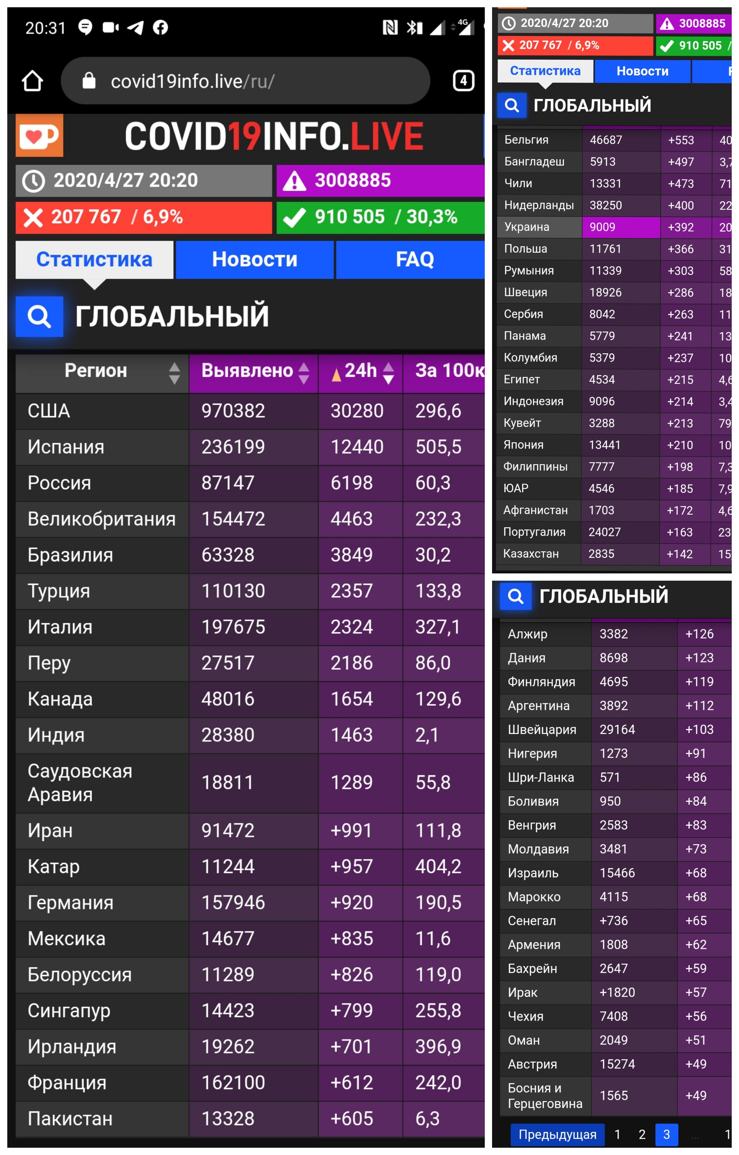 1. Инфицированных более 3млн, очередные 80тыс, из них половина приходится на США+Испания, мы на 3 позиции, Бразилия начинает сползать в экспоненциальный рост, проблемы у Перу, Индия пробует удержаться ниже 1500 в день, снижение по Мексике и Пакистану, рост по Бангладеш это очень эпидемиопасныей и самый густонаселенный район.