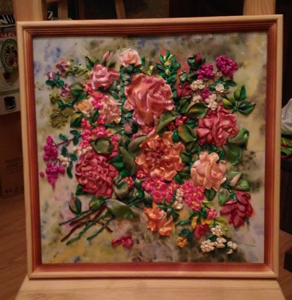 вышивка лентами. тонирование. панно 35*35. винтажный букет.