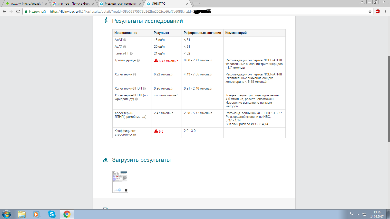 Получила с Инвитро липидный спектр меня не радует. Триклицериды растут,были 4.26(май) стали 6,42 холестерин общий перед терой был 3,8 повысился на второй неделе теры до 6, а теперь.. !?хоть норма по Инвитро Что делать. Это ССС страдает. Пока надо заниматься желудком. Убрать ливодексу(не принимаю) Холестерин она мне не понизила пропила месяц это мало.