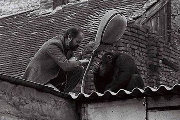 Директор Белградского зоопарка уговаривает сбежавшего шимпанзе по кличке Сами вернуться в зоопарк, 1988 г.