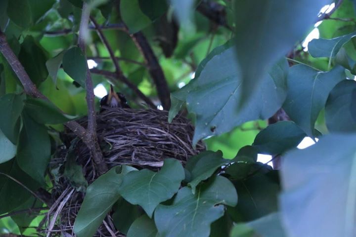 Я долго не мог понять, что наша кошка постоянно высматривает через дверь на террасу. Вчера вечером поливал газон и заметил, что какая-то птичка залетела в крону небольшого деревца японской сирени рядом с террасой и там осталась. Присмотрелся и все понял: пара странствующих дроздов (у нас их ещё называют красногрудыми за счёт яркого оранжево-красного окраса грудины) свила гнездо и высиживают птенцов. Птица достаточно певучая, часто по утрам слышим их трели.