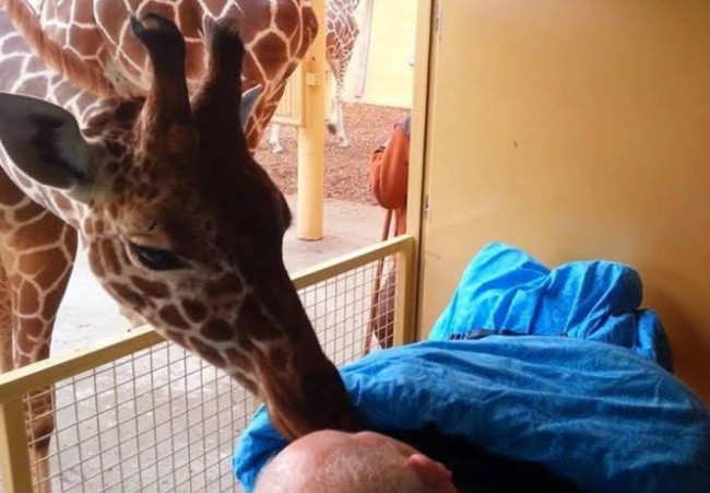 54-летний Марио, у которого обнаружили рак, всю жизнь проработал уборщиком в зоопарке Роттердама. Перед смертью он хотел еще раз увидеть своих животных и попросил, чтобы его кровать привезли в вольер. Работники зоопарка стали свидетелями трогательной сцены, когда жираф пришел попрощаться с Марио.