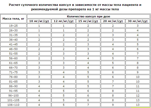 таблица для расчета приема урсосана/урсофалька (капсула 250 мг)