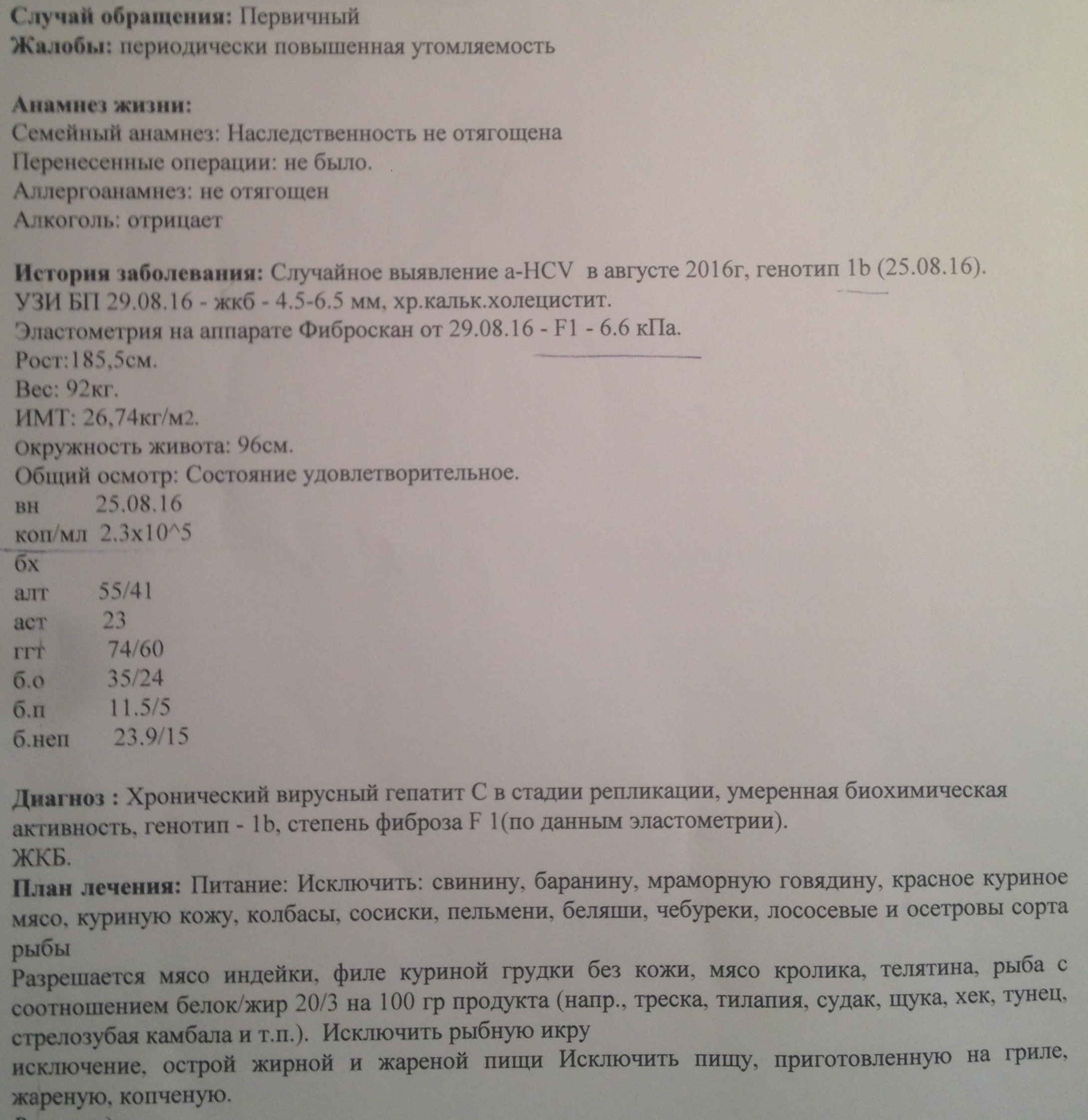 Фиброскан 08.2015 (11.0 КПа ) 01.2016 (10.4 КПа, 07.2016 -7,9кПа