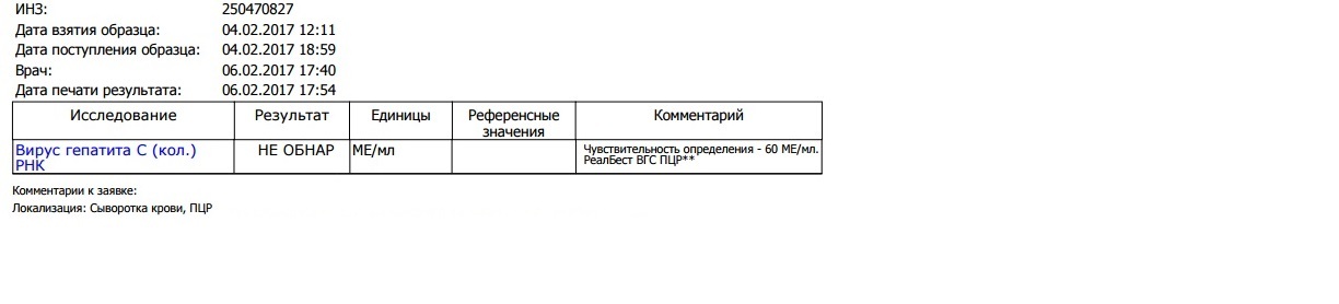 Пишут, что вирус гепатита С (кол.) РНК - не обнаружен....