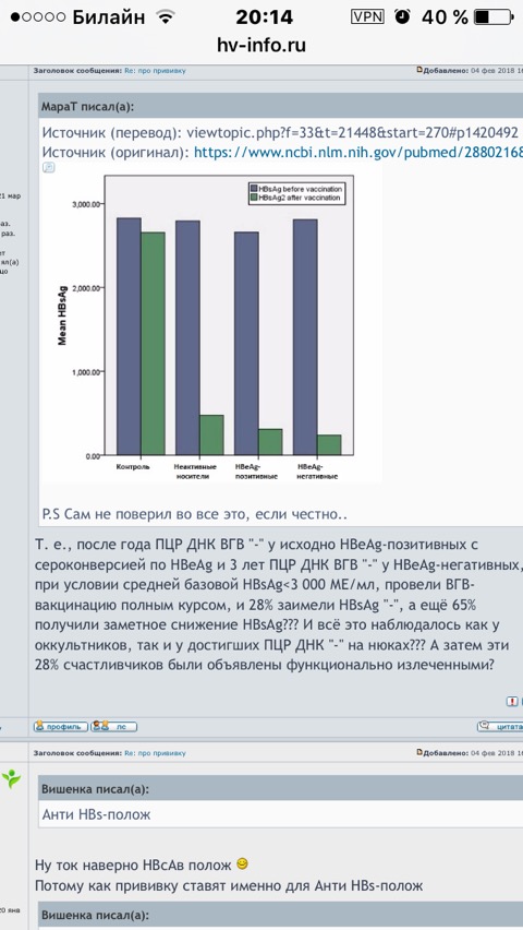 Было бы очень интересно услышать мнение уважаемого Марата (или другого профессионала)) касательно упомянутых выше египетских опытов с вакцинацией пациентов с длительно неопределяемым ДНК и изначально и стабильно невысоким HBsAg. Насколько я понимаю,вакцинация это введение поверхностного антигена с целью вызвать иммунный ответ и стимулировать иммунную систему к выработке антител. Как может и может ли вообще вакцина на что либо повлиять в случае, когда австралиец и так давно и надежно присутствует в крови? Хоть и в относительно невысоких количествах. Меня терзают смутные сомнения, что стабильно невысокий HBsAg сам по себе является предиктором более высоких шансов на спонтанную сероконверсию при длительном подавлении репликации и вакцина тут не причём