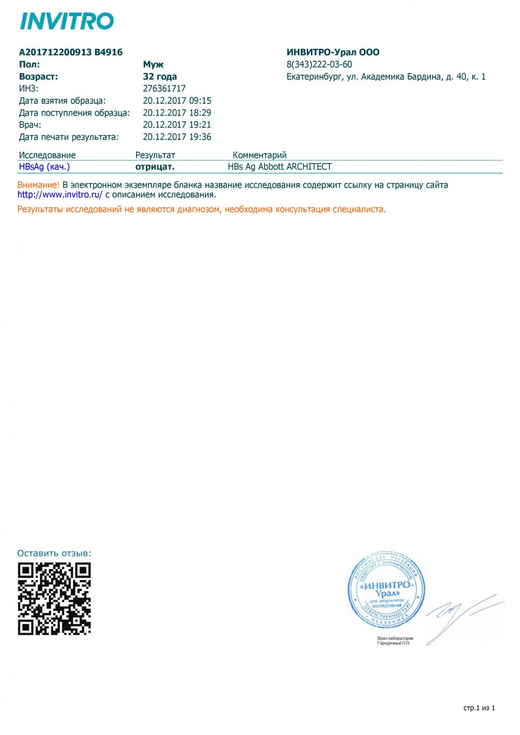 Определение Антигена HBsAg гепатит В- отрицательный
