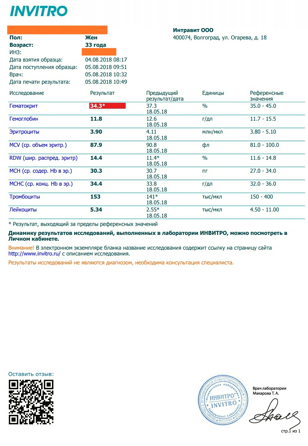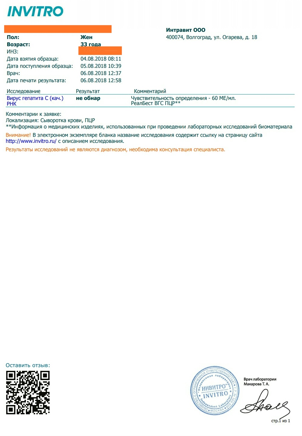 6 нед. - ПЦР - (60МЕ Инвитро)