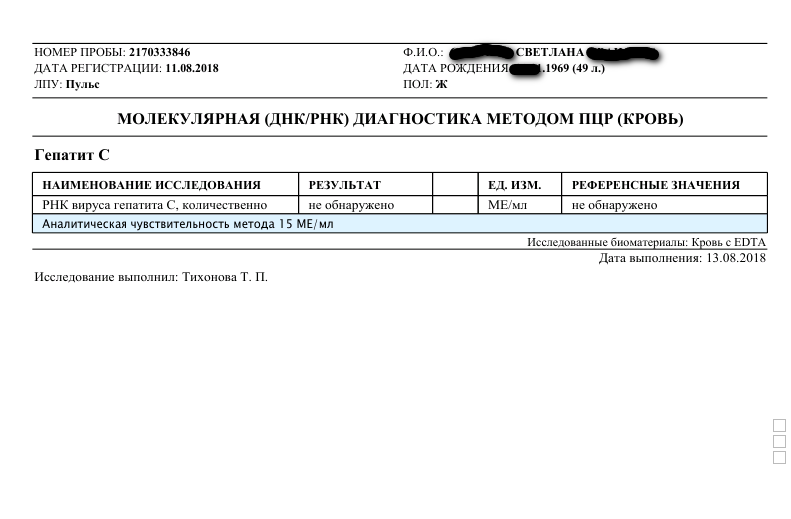 Всем доброго времени суток!!!! Ребята, ура!!!! РНК, колличественный 15ме/моль, НЕ ОБНАРУЖЕНО!!!! А всего лишь две недели прошло!!!! Идем к жирному минусу!!!!! Или стройному, как мне писали