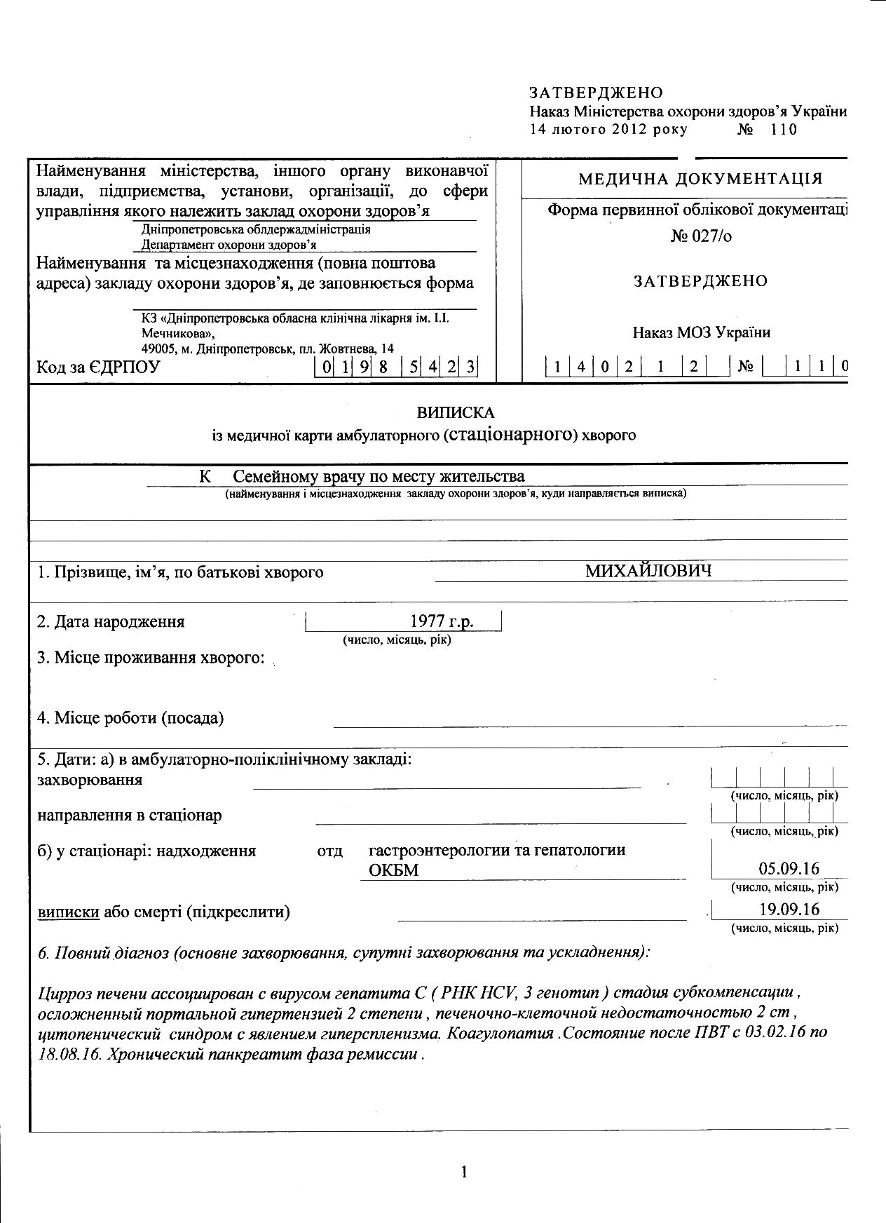 Эпикриз из Мечниково, гастроентерология.