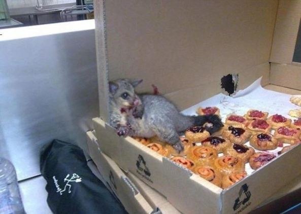 Опоссум ворвался в пекарню. маленько покушал. так его утром и нашли))), не смог передвигаться).