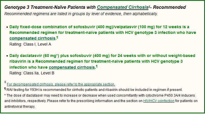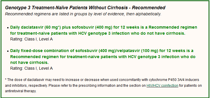 Daclatasvir with sofosbuvir for 12 weeks was approved by the FDA for treatment of HCV genotype 3 infection. The recommendation is based on ALLY-3, a phase III study of the once-daily NS5A inhibitor daclatasvir plus sofosbuvir for 12 weeks; the study included 101 treatment-naïve patients and demonstrated an SVR12 rate of 90%. In treatment-naïve patients without cirrhosis (Metavir F0-F3), 97% achieved SVR12, and in treatment-naïve patients with cirrhosis (Metavir F4), 58% achieved SVR12. (Nelson, 2015) This suggests that patients with genotype 3 infection and cirrhosis are likely to benefit from an extension of therapy. This has been confirmed in cohort studies, including the European compassionate-use program, which reported SVR12 rates of 70% versus 86% when daclatasvir and sofosbuvir were used for 12 weeks and 24 weeks in HCV genotype 3-infected patients with cirrhosis, respectively. The role of ribavirin could not be clarified, as only 4 patients received daclatasvir plus sofosbuvir and ribavirin for 12 weeks, all or which achieved SVR12. SVR12 was comparable between the 24-week arms irrespective of the addition of ribavirin (85.9% [116/135] without compared to 81.3% [39/48] with ribavirin). SVR12 rates were also higher in those with compensated Child-Pugh A cirrhosis (85-90% compared to 70.6% in Child B/C). Again the addition of ribavirin did not increase SVR12 rates in the 24-week arms. (Hezode, 2015b) 73% of patients were treatment-experienced, however earlier data suggested that SVR12 rates were higher in treatment-naïve patients (91-100%) compared to experienced (81-82%). SVR12 rates were similar in those that received ribavirin (88%, 29/33) and those that did not (86%, 42/49). (Hezode, 2015b)