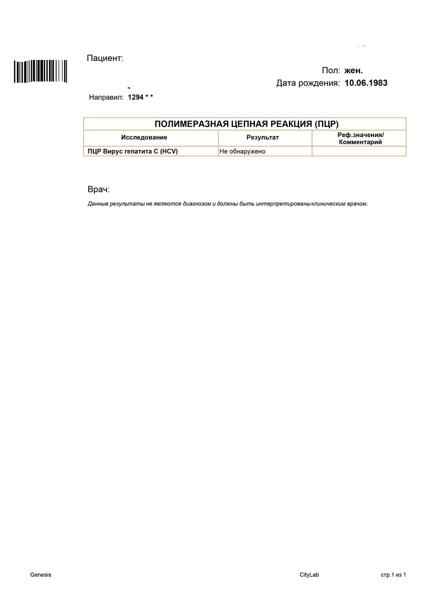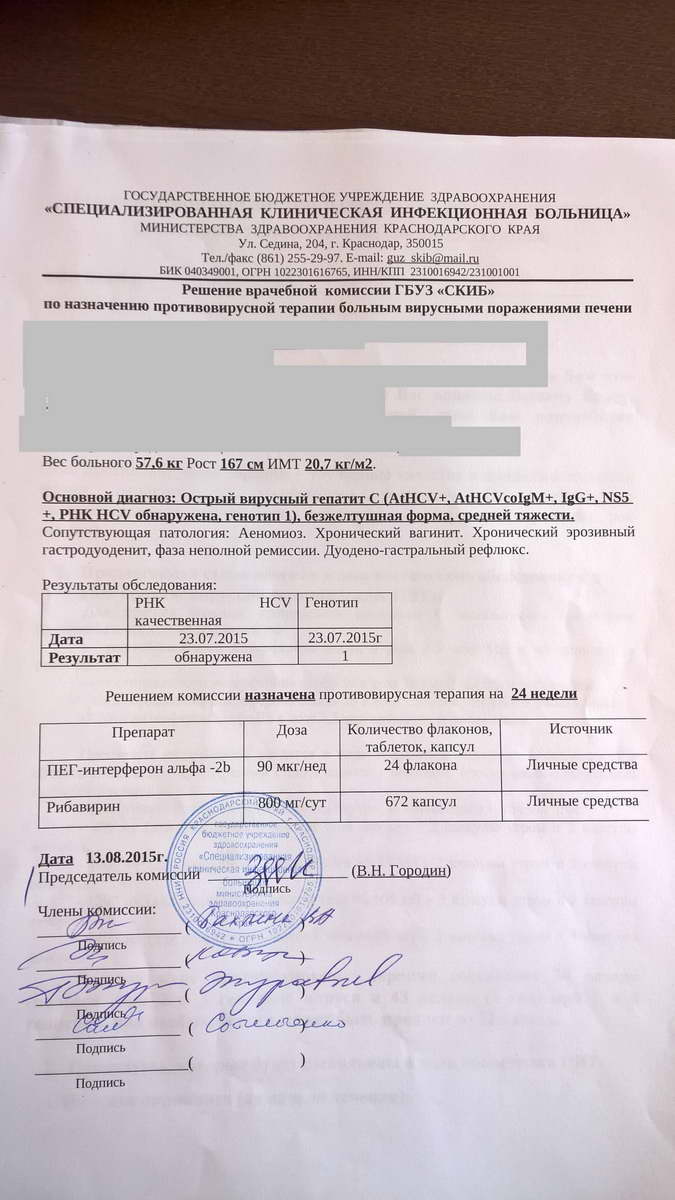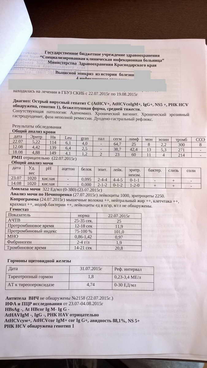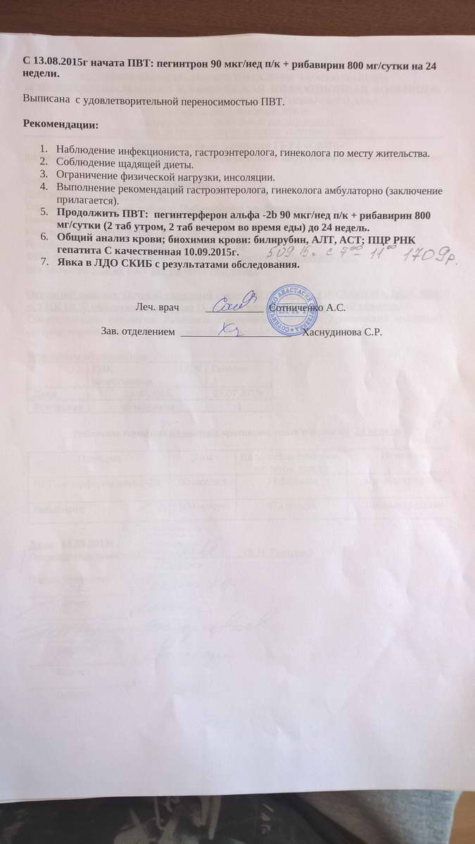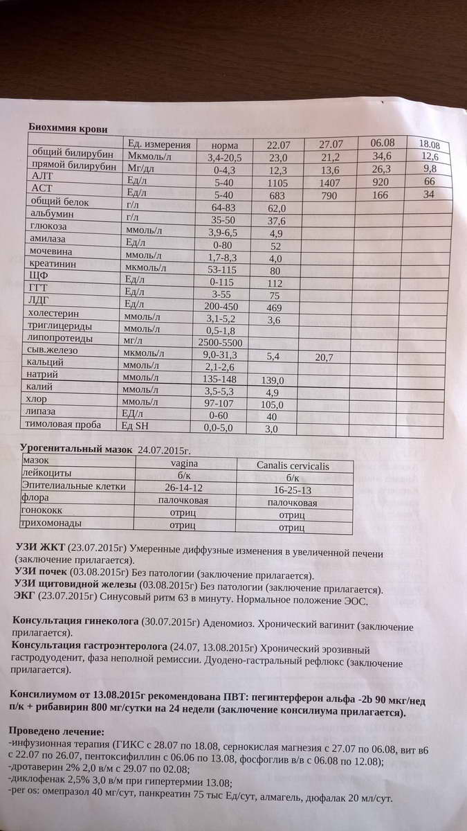 Направили сразу в инфекционку, там повторно взяли анализы и вуа-ля. Сразу же положили в стационар . После всех анализов и обследований через несколько дней поставили диагноз - острый вирусный гепатит С , 1 генотип. Очень долго снижали АЛТ и АСТ , капельницы , уколы и прочее. Сразу после капельниц АЛТ поднималось аж до 1500, начали делать фосфоглиф , через пару недель снизили , затем 13 августа был консилиум и ПВТ. Назначили Пегентрон + рибаверин. На сей момент 17.09 , сегодня уже 6 укол.