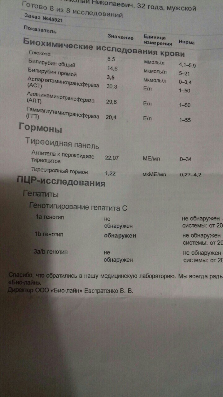 Всем привет! Болеет мой брат,геп С 1b. Я здесь за него. Был повышен билирубин при не большой операции в 2012 году. Его тогда избили, вот и подумали, что билирубин высокий из-за травм. Врачи посоветовали сдать анализы на гепатит. Вобщем потом забыли... Дошёл до лаборатории только в этом году.
