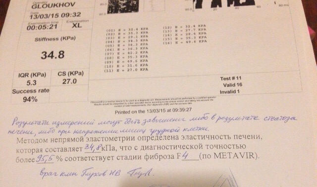 Фиброскан 08.2015 (11.0 КПа ) 01.2016 (10.4 КПа, 07.2016 -7,9кПа