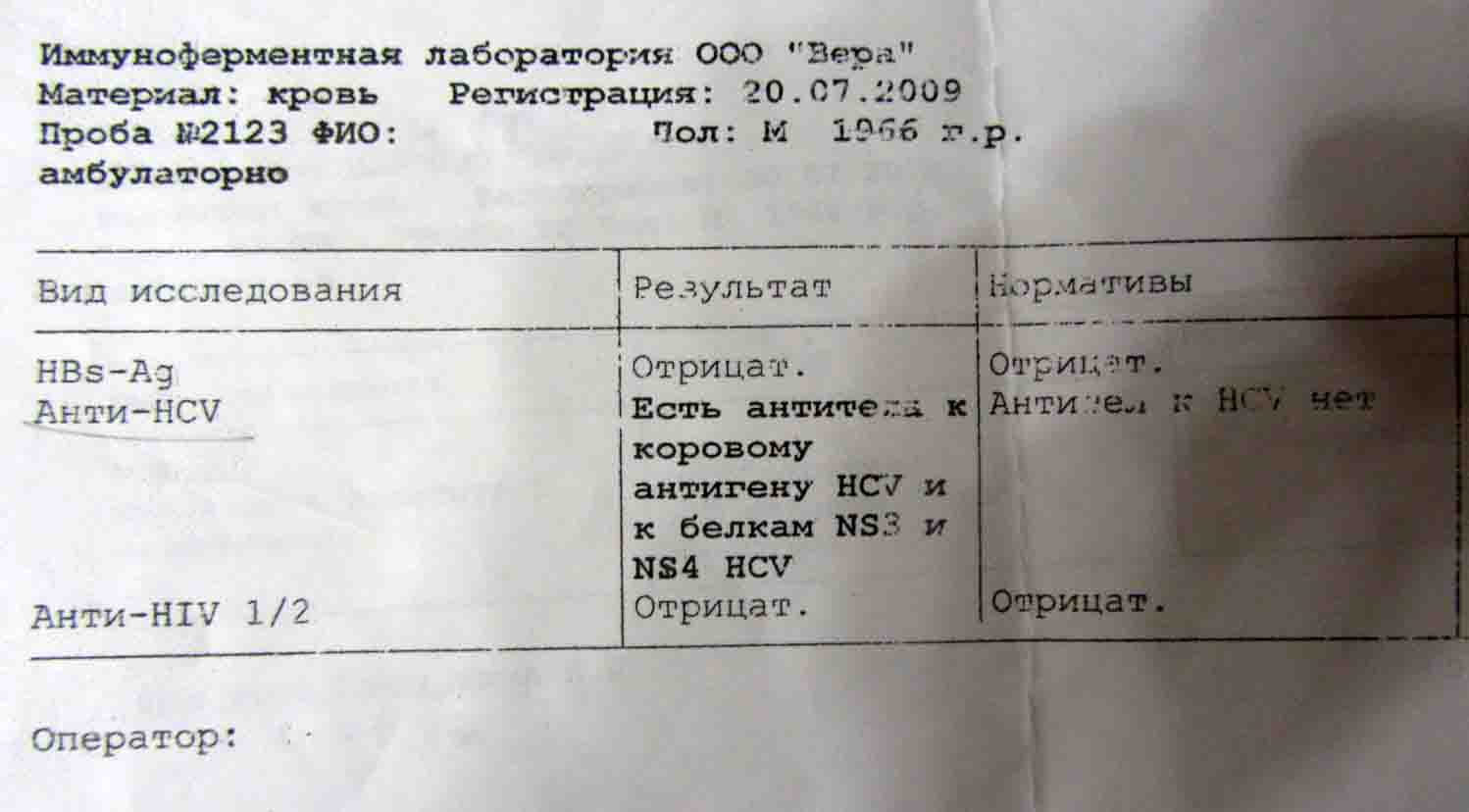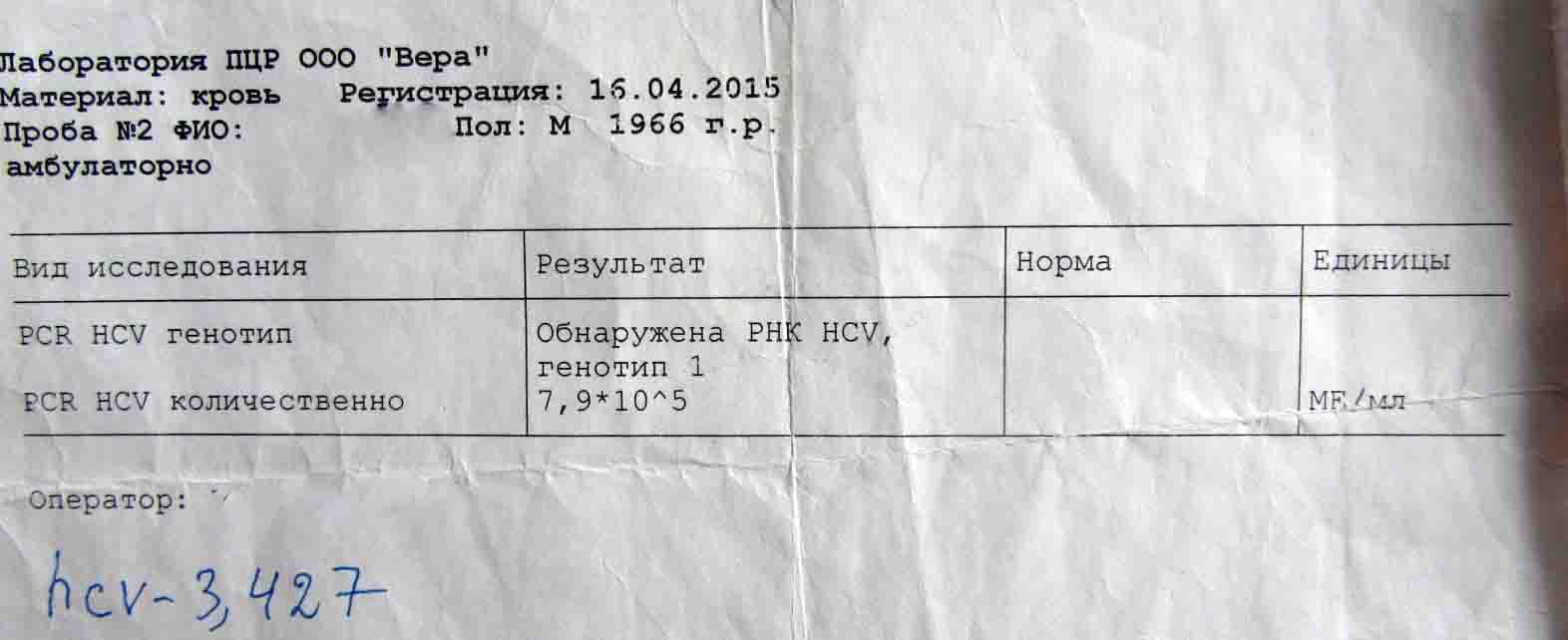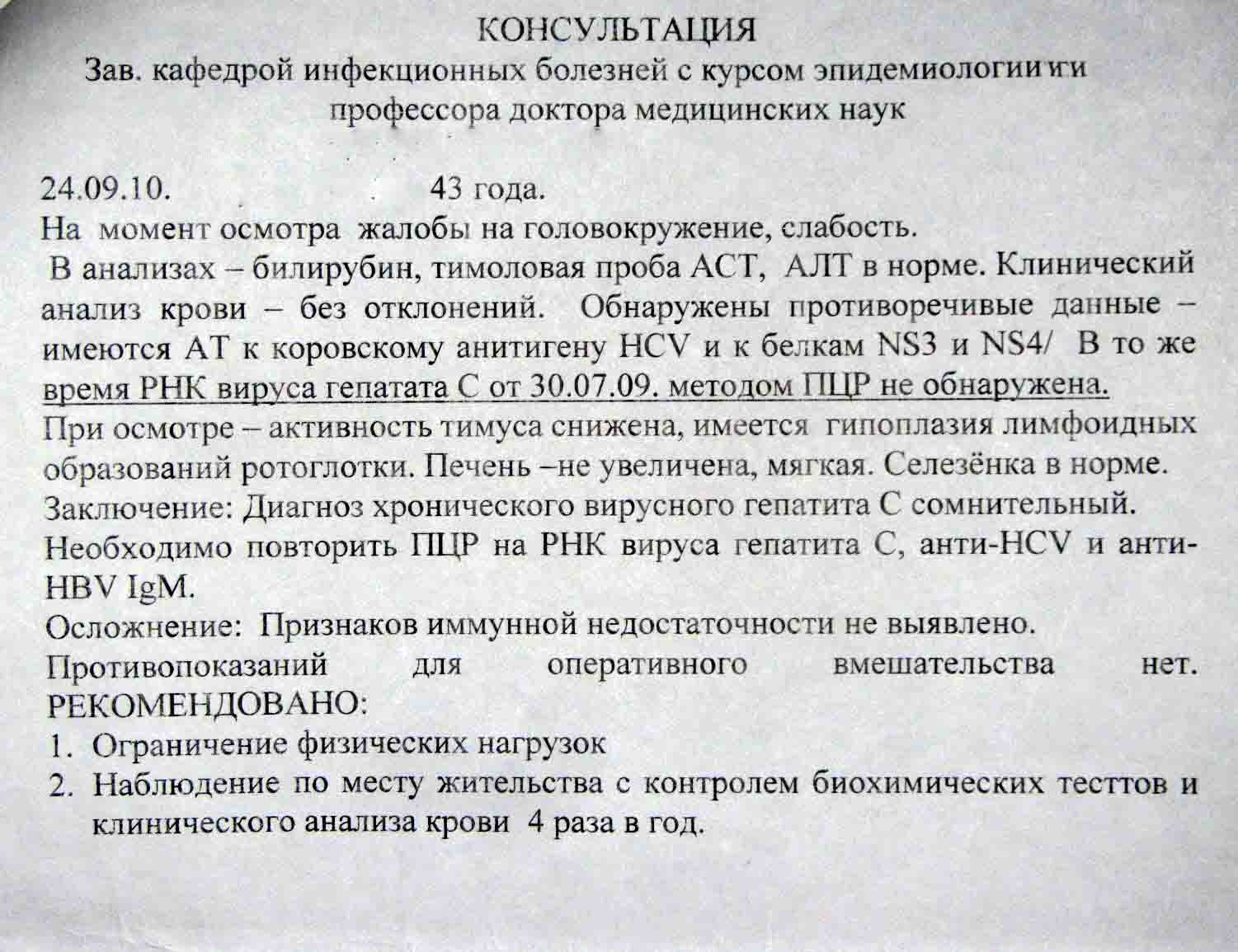 Врач (женщина-хирург) сказала, что скорее всего у меня гепатит С в острой форме. Отправила сдавать все анализы крови и пцр. анализы кроме наличия антител к hcv и повышенного холестерина оказались идеальными. направила меня к профессору, у которого когда-то училась. Отсюда и появилось это заключение, которое вы сейчас можете прочитать... в то время2009год я пришел на сайт и увидел, что лечение очень дорогое. Решил больше не ходить по врачам и не сдавать анализы. Пил фенотропил