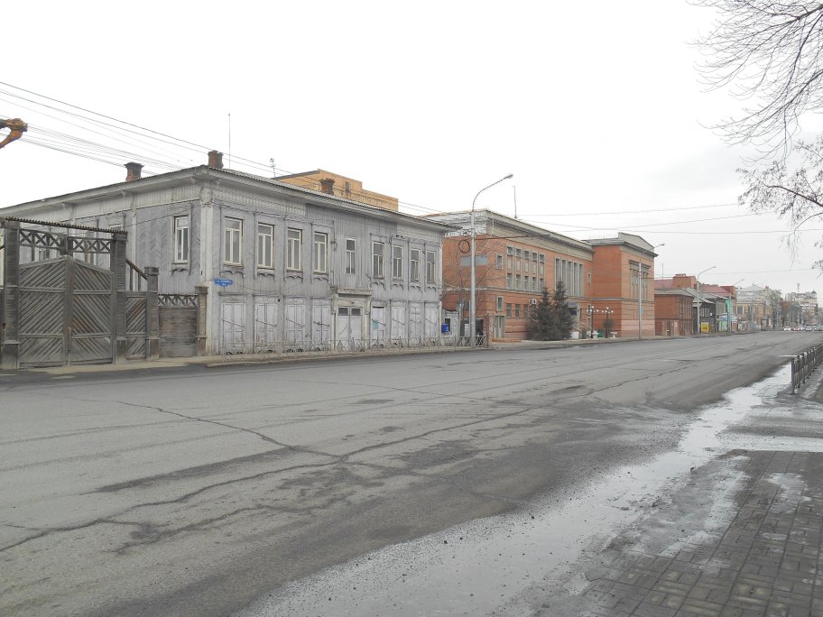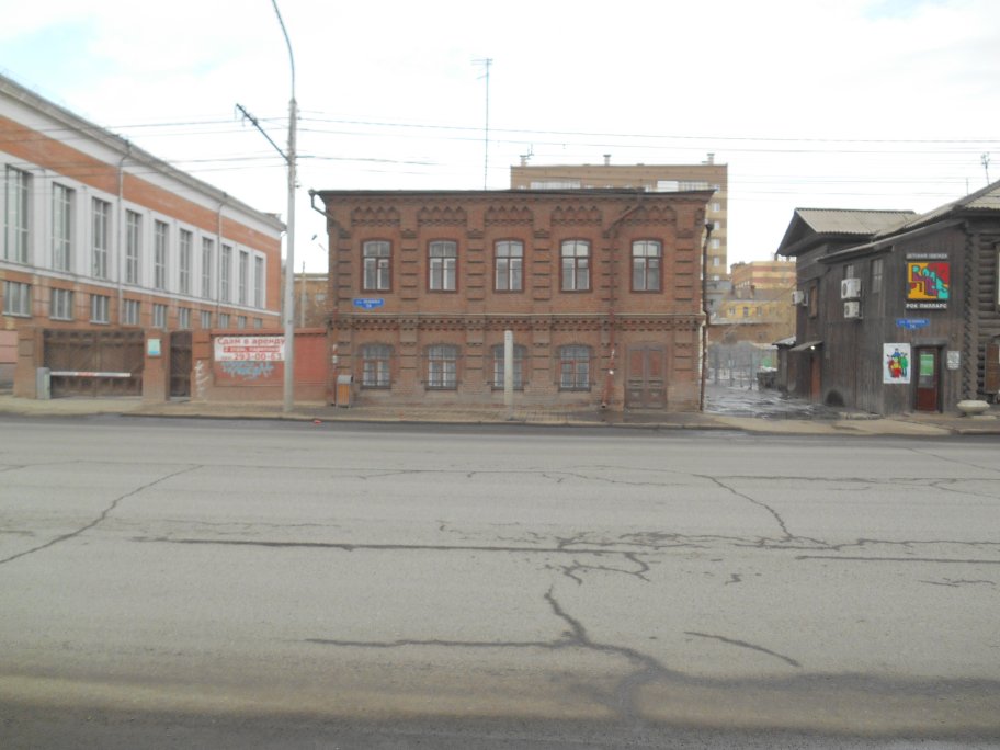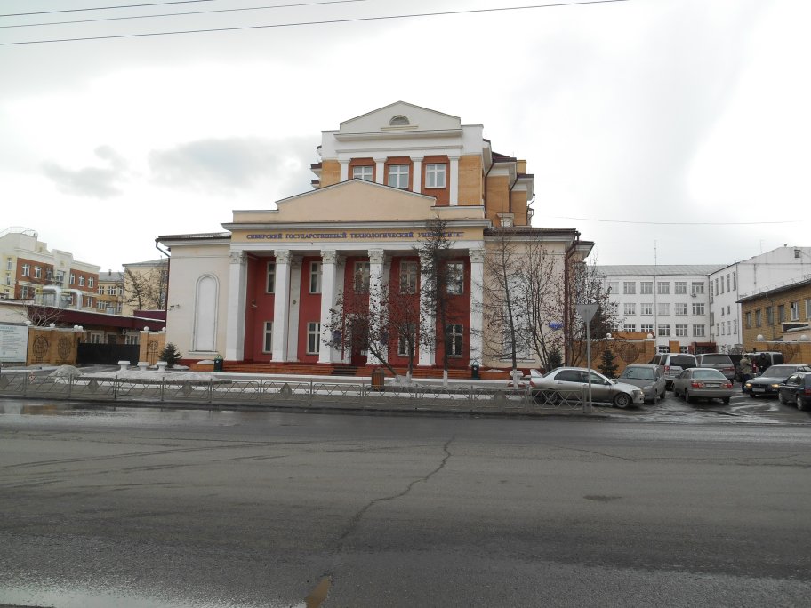 Дальше - жилой дом на Ленина, 84 (памятник архитектуры: в доме мещанина П. В. Коломейцева, построеного в 1911 году, находилась его собственная колбасная торговля), а рядом с ним новый кирпично-красный корпус Сиб(ирского)Г(осударственного)Т(ехнологического)У(ниверситета), бывший технологический институт, «технолага», «технолажа». Как раз напротив основного корпуса, который имеет парадные входы сразу с двух параллельных главных улиц - Ленина и Мира.