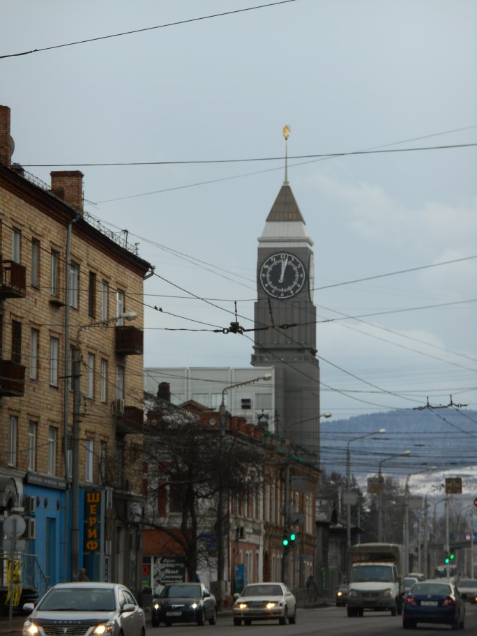 Угол здания администрации на театральной площади заканчивается башней. В советское время там сияли зелёным светом цифровые часы/градусы/календарь. Сейчас башню надстроили, и на все четыре стороны гордо глядят куранты. Правда дотошные жители города периодически замечают, что время на циферблатах несколько разное, но продолжают гордиться этим сооружением.)))