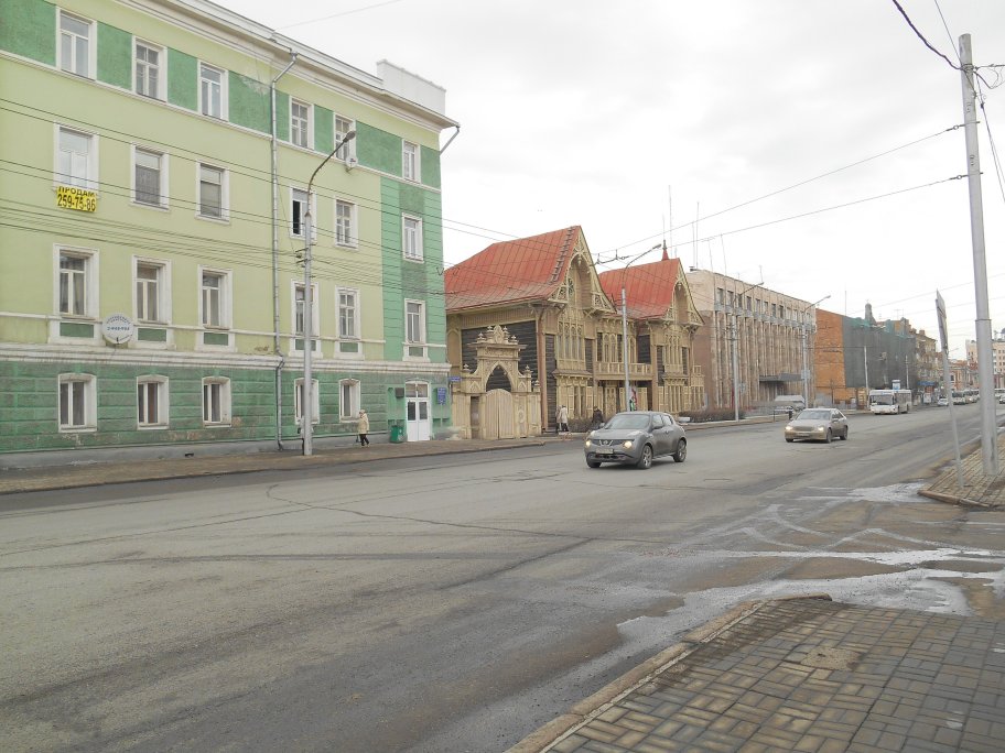 Мы уже дошли до улицы Сурикова. Дальше по Ленина в сторону Стрелки два старинных дома, затем пара банковских резиденций красного кирпича и элитная жилая новостройка с башенкой.